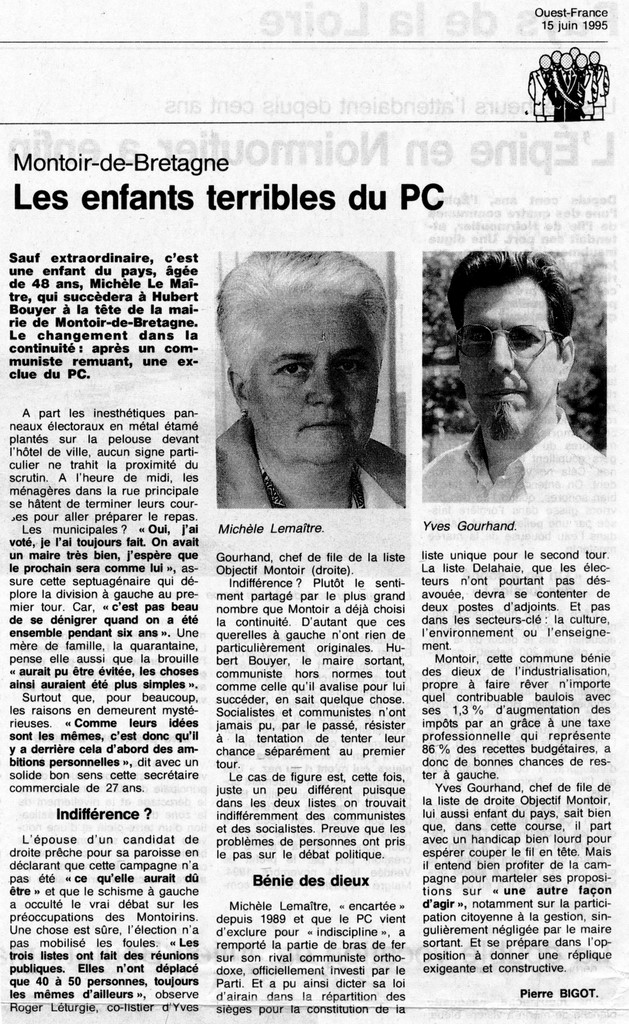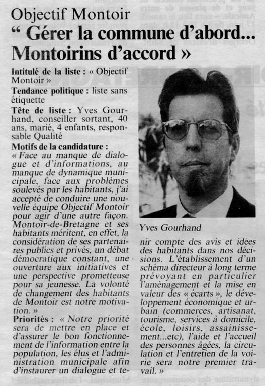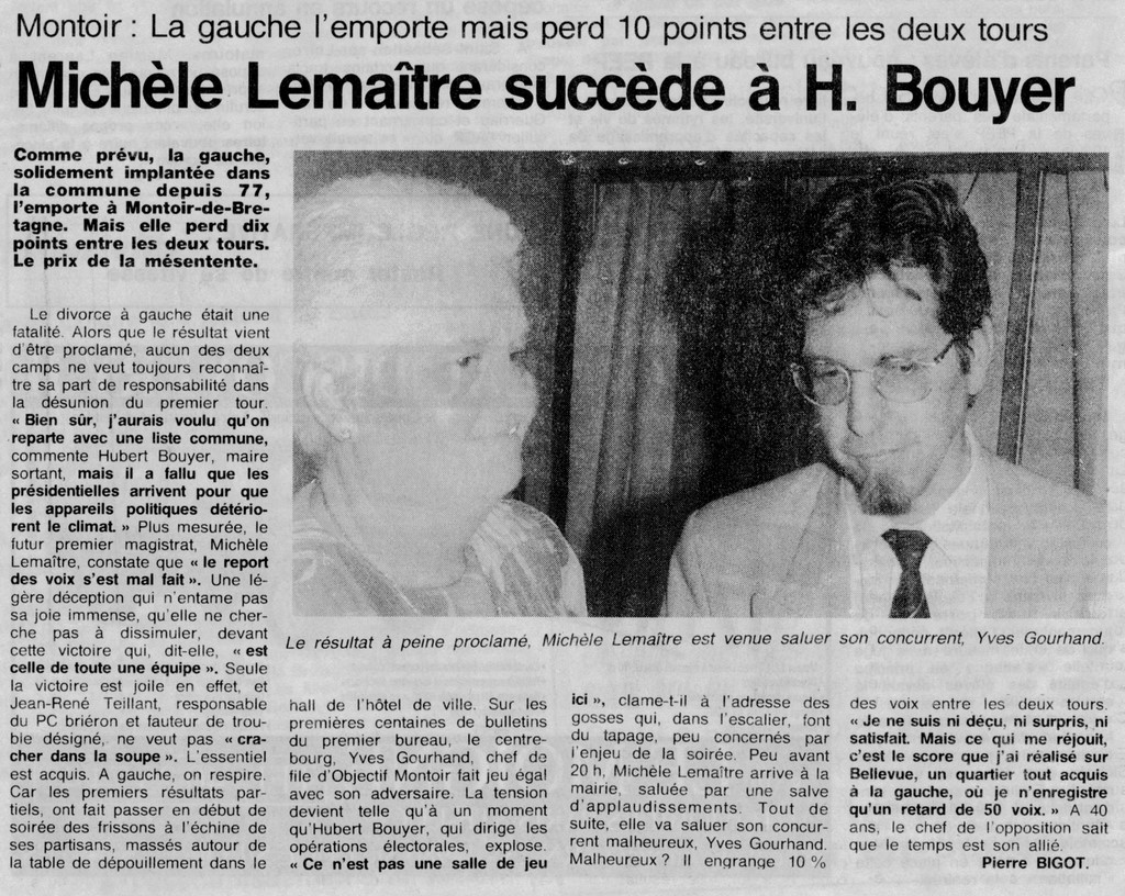 Liste de la gauche plurielle : 22 élus (1240 voix-51,84%) Michèle Lemaître, Marcel Leclerc, Hubert Delahaie, Paul Leveau, Chantal Beyer, Marcelle Delugre, Daniel Le Barillec, Martial Métayer, Christian Guiheneuf, Françoise Lastennet, Chantal Noury, Patricia Jouin, Isabelle Roulier, Michel Guégan, Joël Jouan, Martine Vaugrenard, Sonia Mahé, Claude Munier, Jean-Paul Martineau, Mireille Chedotal, Séverine Richard, Henri Poyard, Véronique Cabelguen, Roger Etogo, Yvette Baleine, Catherine Leguébe, Patricia Guillaume, Joël Cadoret, Patrick Graton.