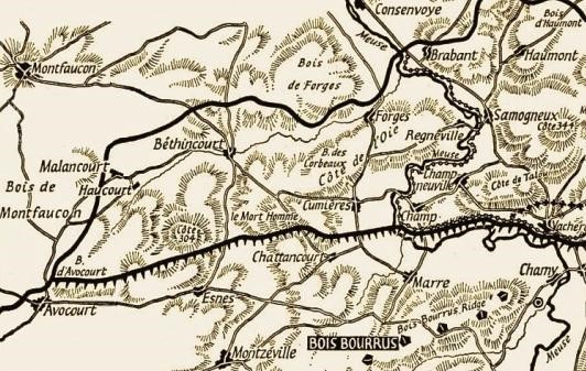 Au pied de la cote 304 se tenait le 154e régiment, en liaison avec le 155e qui défendait le village de Cumières.