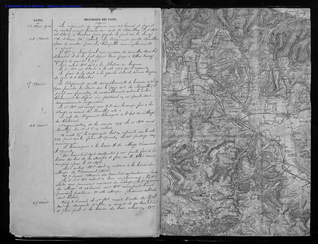 Combat de Chaumont - Saint-Quentin 27 août 1914 Le 1er Bataillon reçoit l'ordre du Colonel commandant la Brigade de remplacer en avant de lui, plus près de la lisière du bois le bataillon du Commandant Lequeux du 93e dont les munitions sont épuisées, et de se tenir prêt à prendre l'offensive. A peine est-il en ligne, à 6 heures, que l'attaque allemande se produit. Notre artillerie fouilla le bois de la Marfée et les pentes de la cote 346. Le 1er bataillon répond vigoureusement à la fusillade allemande. L'ennemi ne peut se maintenir. Le 1er bataillon voyant son arrêt, se porte en avant ; quelques fractions du 64e R.I. l'accompagnent. Le 1er Bataillon conduit l'attaque sur la cote 346 comme objectif, avec les 1re , 3e et 4e Compagnies. La 2e compagnie, restée sur la gauche en lisière des bois, s'avance en échelons et couvre le flanc du bataillon. Le Sous-Lieutenant Conte prend dans une crevasse le Lieutenant-Colonel de Falkenstein, commandant le 24e Régiment allemand. Le 2e Bataillon oriente aussi sa 5e compagnie sur la cote 346 pendant que les 6e , 7e et 8e Compagnies attaquent Noyers, en liaison avec le 59e (17e corps). L'assaut est donné sur cote 346 ; et bientôt après le 2e bataillon pénètre dans Noyers à la baïonnette. La section du Lieutenant Daunizeau s'empare du Drapeau du 68e allemand. Les Allemands sont en fuite ; ils dévalent les pentes vers la Meuse dans laquelle ils se jettent, pour s'abriter dans les roseaux, du feu de nos fusils. Le régiment tout entier les repousse avec enthousiasme. Le cri de « Vive la France » s'échappe de toutes les poitrines. Mais ce succès est obtenu au prix de durs sacrifices, 6 Officiers tués, 5 Officiers blessés et nombreuses pertes de gradés et de soldats. Le Colonel De Marolles avait été mortellement atteint. Le Commandant Laffont De Ladedat avait pris le commandement du Régiment. Les allemands prononcent avec de gros effectifs de troupes fraîches un vigoureux retour offensif. Nos régiments mélangés et exténués doivent céder sur tout le front et se replier sur Chaumont - Saint-Quentin et Bulson. Le 137e bivouaque au Nord de Bulson. Le Colonel De Marolles atteint d'une balle en pleine poitrine avait été transporté à la Maisoncelle, petit village à 3 kilomètres de Bulson. Assisté à ses derniers moments par l'Aumônier Divisionnaire, M. l'abbé Michaud, le valeureux Colonel qui venait de donner à sa troupe pendant toutes ces rudes journées le plus bel exemple de courage et de dévouement eut la satisfaction d'apprendre avant de mourir la victoire du 137e et la prise du Drapeau Allemand. « Je meurs content, mes soldats sont des braves », furent ses avant-dernières paroles prononcées en souriant et suivies, bientôt après, de ces derniers mots : « Mon Dieu... La France ».