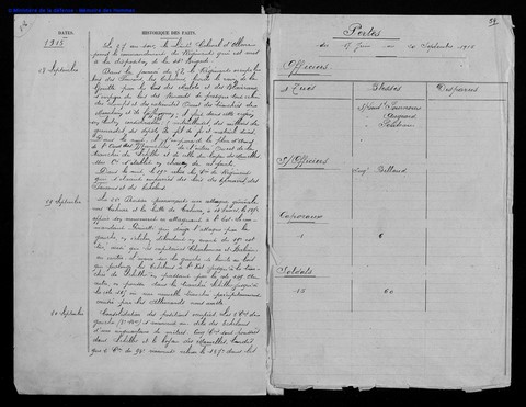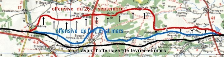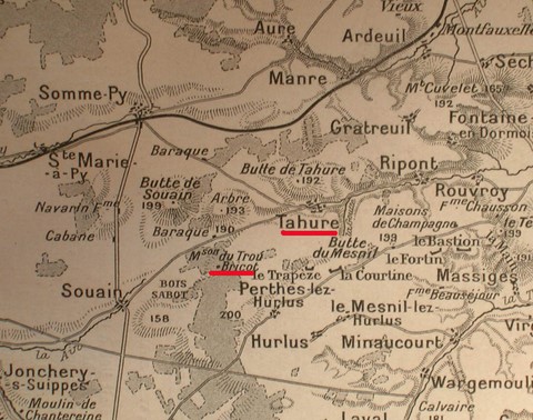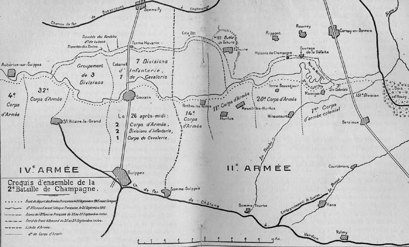 29 Septembre. - La 22e D. I. prononçant une attaque générale vers Tahure et la Butte de Tahure, à 14 heures, le 137e appuie son mouvement en attaquant à l'Est. Le Commandant Perinetti qui dirige l'attaque par la gauche, en échelon, débordant en avant du 19e, est tué, ainsi que les capitaines Charbonnier et Babiau, au centre. L'avance sur la gauche se limite au bois qui prolonge les Echelons à l'Est jusqu'à la Tranchée de Schiller en passant par la cote 149. Au centre, on pousse dans la Tranchée Schiller jusqu'à la cote 165 où une nouvelle tranchée précipitamment creusée par les Allemands nous arrête.